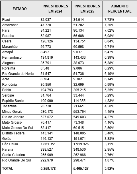 Confira abaixo o total de investidores em cada estado no comparativo entre 2024 e 2025: