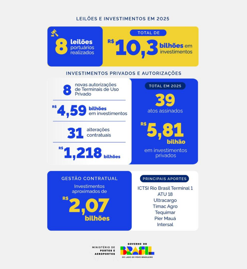 Em 2025, o Ministério de Portos e Aeroportos (MPor), por meio da Secretaria Nacional de Portos, realizou oito leilões portuários, que somam R$ 10,3 bilhões em investimentos nas regiões Sul, Sudeste e Nordeste. Os projetos contemplam a ampliação da capacidade, a modernização da infraestrutura e o aumento da eficiência operacional dos terminais.